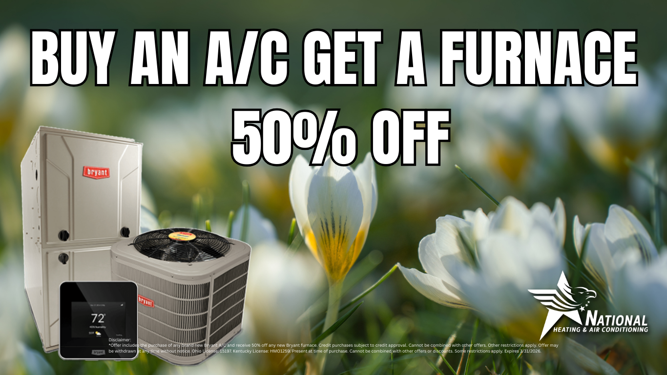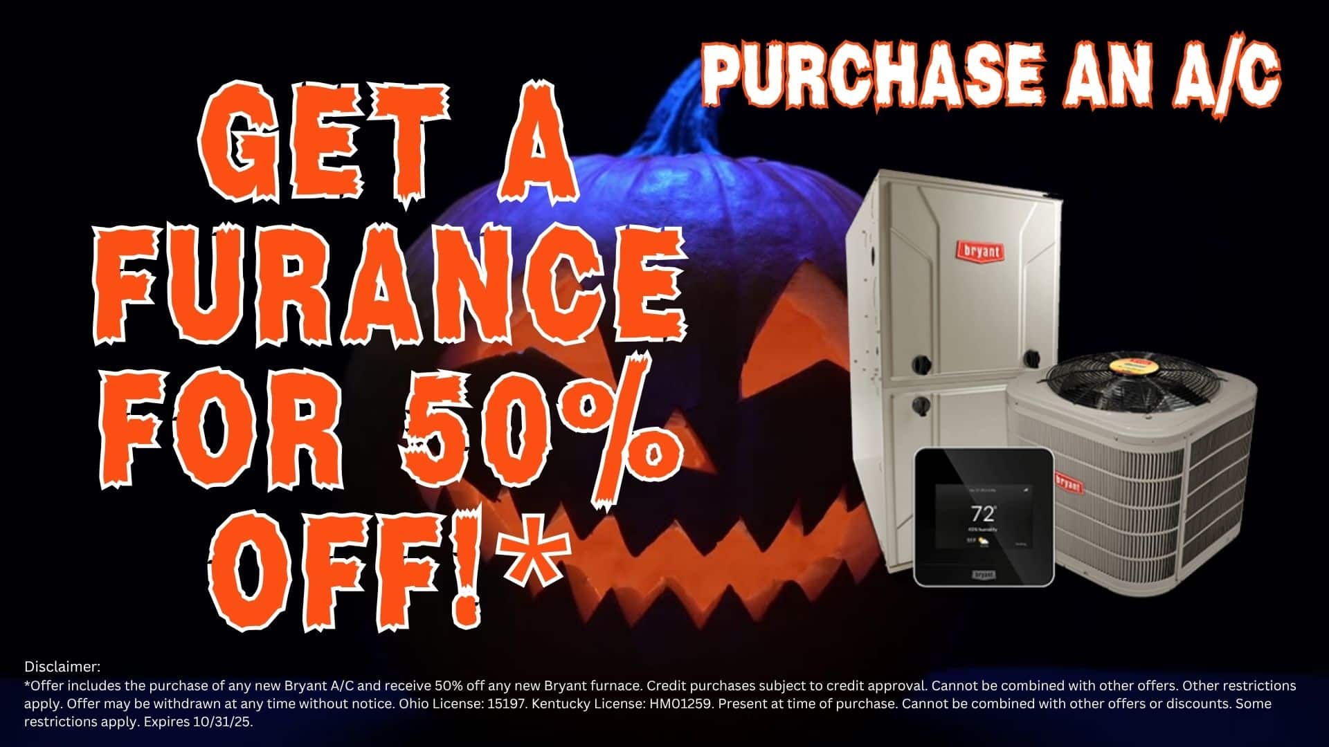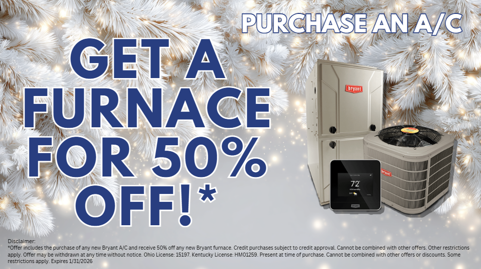 *Offer includes the purchase of any new Bryant air conditioner and receive 50% off any new Bryant Furnace 96% minimum efficiency. Must be a maintenance member to receive 10 years parts and 10 years labor warranty. Credit purchases subject to credit approval. Cannot be combined with other offers. Other restrictions apply. Offer may be withdrawn at any time without notice. Ohio License: 15197. Kentucky License: HM01259. Present at time of purchase. Cannot be combined with other offers or discounts. Some restrictions apply.